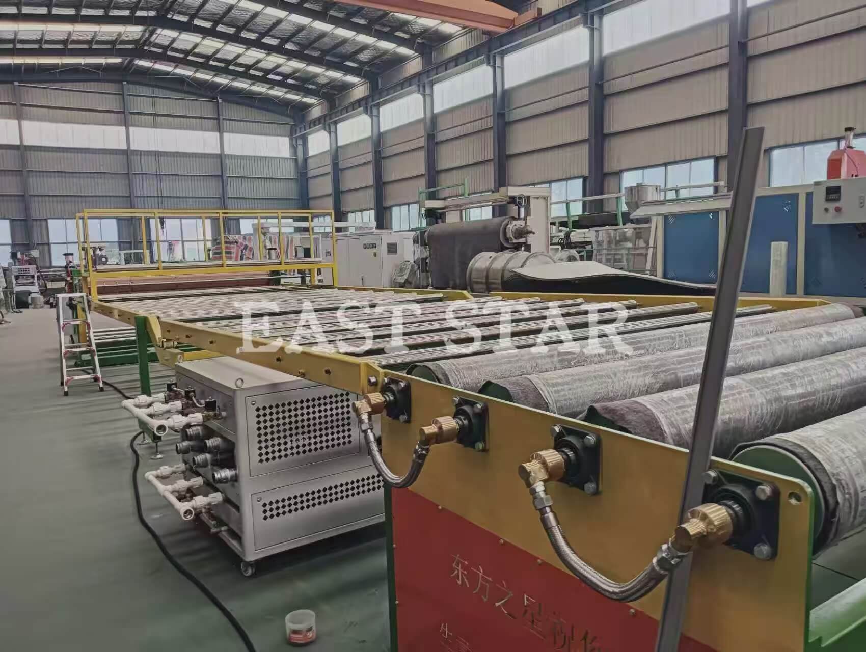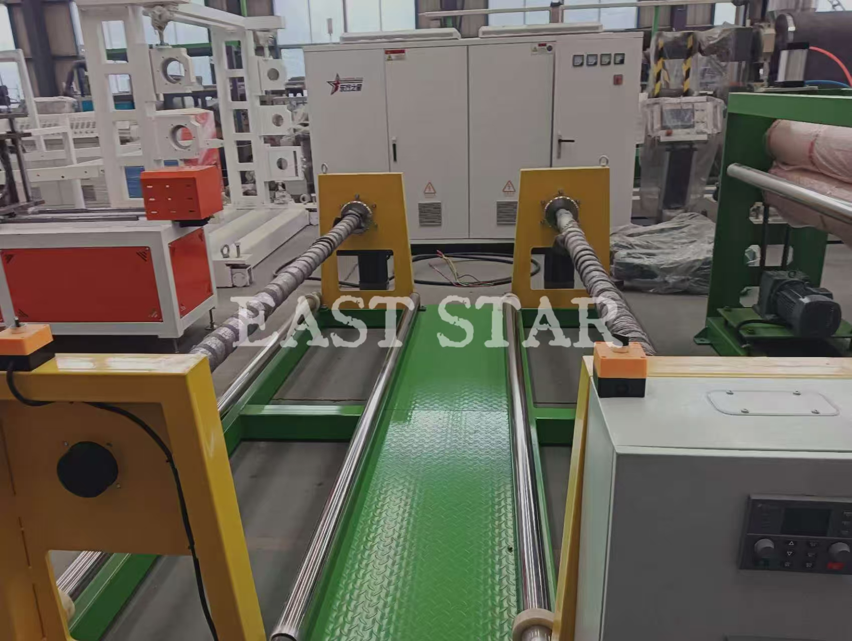 · Kolmirullainen kalanteri: Jäähdyttää ja kiillottaa sulan suulakepuristetun levyn ja säätelee tarkasti lopputuotteen paksuutta ja viimeistelyä.