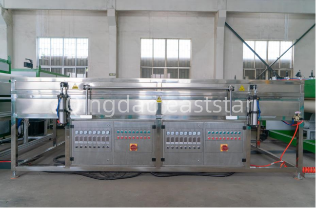 KokoPP-avosoluverkkopaneelilaitteetsisältää myös akaksiasemainen hydraulinen näytönvaihtaja, atasoitusuuni, ja avoimakasilmajäähdytyslaite. Ensimmäinen vetokone on varustettu 6 parilla 12 kumirullaa, joiden kunkin rullan pintakoko on ¢250x2300 mm ja jota käyttää 7,5 kW:n moottori. Tasoitusuunin lämpötilan säätöalue on 40℃-150℃ jaettuna 16 vyöhykkeeseen lautojen tasaisuuden varmistamiseksi. ThePP onttolevyn tuotantolinjaon myös varustettu poikittaisleikkauskoneella ja pinoamisalustalla automatisoidun tuotannon saavuttamiseksi.