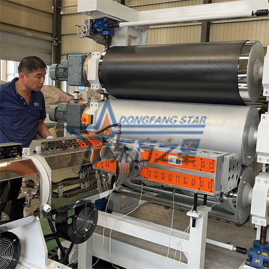 Pehmeä PVC:n antistaattinen ekstruuderilaitteisto: Laitteet koostuvat pääasiassa 120 yksiruuvipuristimesta, kolmirullaisesta kalanterista, jäähdytyskannattimesta, kumirullan vetokoneesta, leikkauskoneesta ja